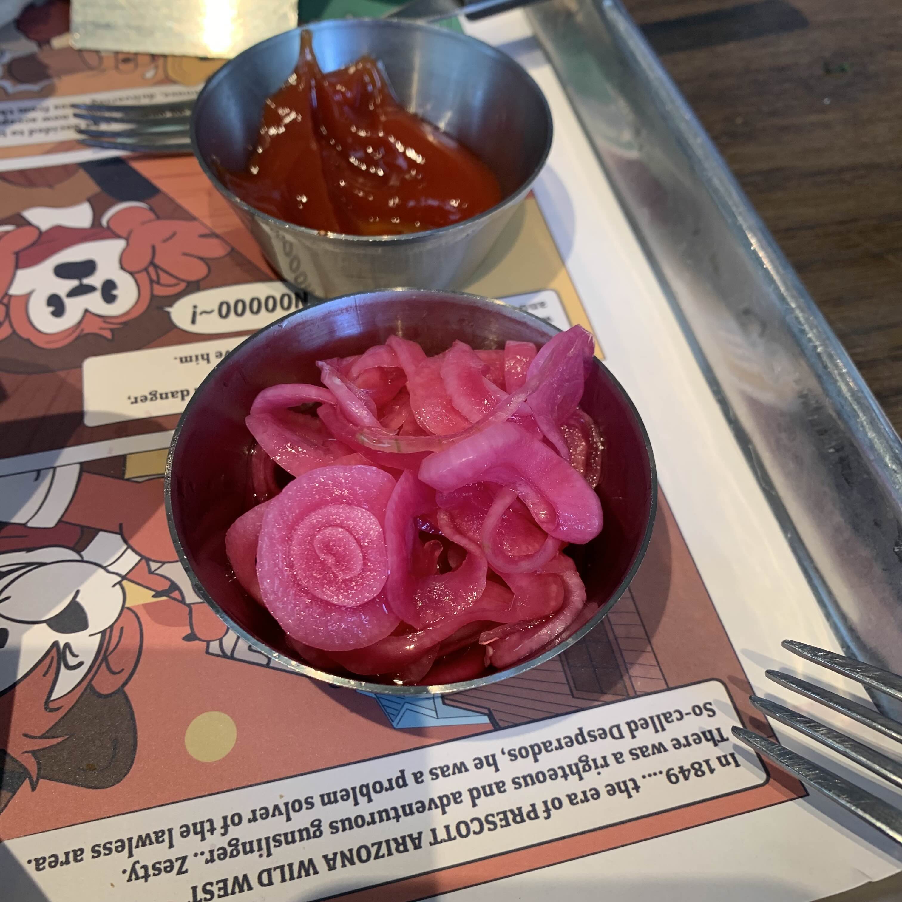 셀프바에 물, 양파피클, 케찹, 티슈, 핫소스가 준비되어있다.
